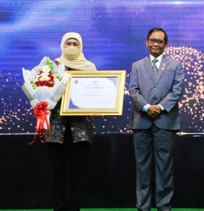 Kedua penghargaan tersebut diserahkan langsung oleh Plt Menteri Pendayagunaan Aparatur Negara dan Reformasi Birokrasi (PAN RB) Prof Mahfud MD dan Kepala LAN RI Adi Suryanto kepada Gubernur Khofifah Selasa (9/8) di Jakarta. Penghargaan ini juga digelar sebagai rangkaian peringatan HUT ke-65 LAN RI.