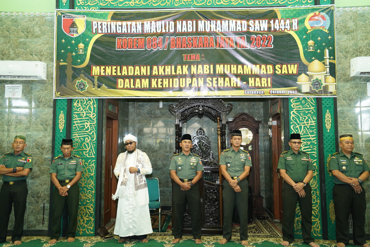 SURABAYA, KABARHIT.COM - Korem 084/Bhaskara Jaya memperingati Maulid nabi Muhamad SAW 1444 H/2022 M di masjid Al-Wathon Makorem yang dihadiri oleh Kasrem 084/BJ Kolonel Inf H. Sugiyono, S.Sos., M.SI., Kasiren dan para Kasi Kasrem 084/BJ. Kamis (13/10/2022)