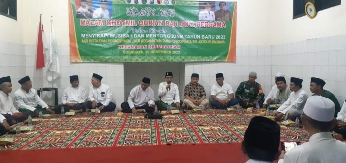 SURABAYA, KABARHIT.COM - Koramil 0830/01 Krembangan ikuti kegiatan Khotmil Qur'an dan Doa Bersama dalam rangka menyikapi musibah selama di tahun 2022 dan menyongsong tahun baru 2023 di musholla kantor kecamatan krembangan Jl. Gresik no. 49, jumat (30/12/2022) malam.Pelda yoko Batituud Koramil 0830/01 Krembangan saat ikuti kegiatan menuturkan, bahwa kegiatan doa bersama ini merupakan bagian dari refleksi muhasabah diri dan renungan akhir tahun 2022, serta sebagai evaluasi berkaitan dengan berbagai hal evaluasi selama satu tahun ke belakang, ucapnya.