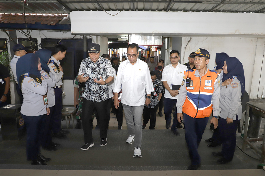 SURABAYA, KABARHIT - Wali Kota Surabaya Eri Cahyadi mendampingi kunjungan Menhub RI Budi Karya Sumadi di Terminal Purabaya Sidoarjo. Mereka membahas rencana pembangunan jalur transportasi KA.