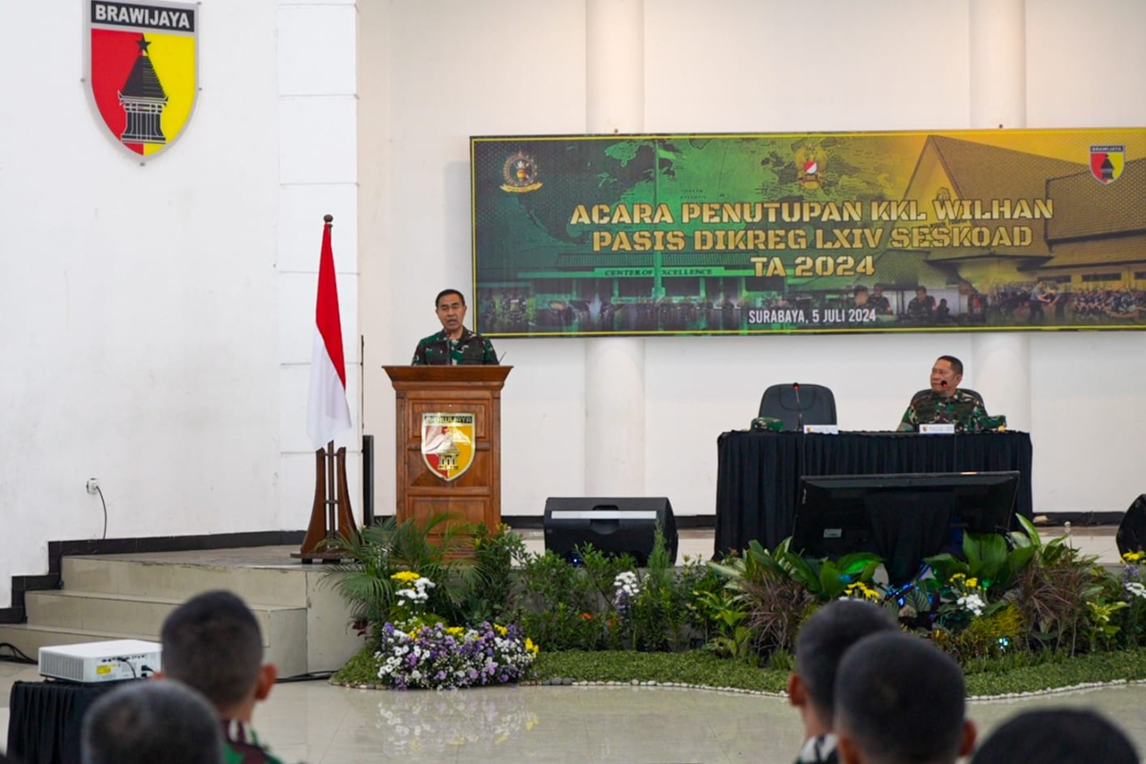 GRESIK, KABARHIT.COM - Kuliah Kerja Lapangan Wilhan Dikreg LXIV Seskoad TA 2024 di wilayah Kodam V/Brawijaya secara resmi ditutup oleh Danseskoad Mayjen TNI Agus Prangarso, S.Sos. bertempat di Aula Makorem 084/ Bhaskara Jaya Jl. Ahmad Yani No. 1 Wonocolo, Surabaya, Jawa Timur. Jumat (5/7/2024).