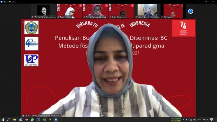 KABARHIT, SURABAYA - Universitas Dr. Soetomo (Unitomo) Press menggelar Webinar dan Peluncuran Book Chapter Abdimas bertajuk Persembahan Unitomo untuk Negeri. Kegiatan Webinar yang mengusung tema Penulisan Book Chapters dan Diseminasi BC Metode Riset Akuntansi Multiparadigma sepenuhnya berlangsung secara daring dengan menggunakan zoom meeting sebagai media pertemuan dan juga live streaming melalui youtube chanel Unitomo.